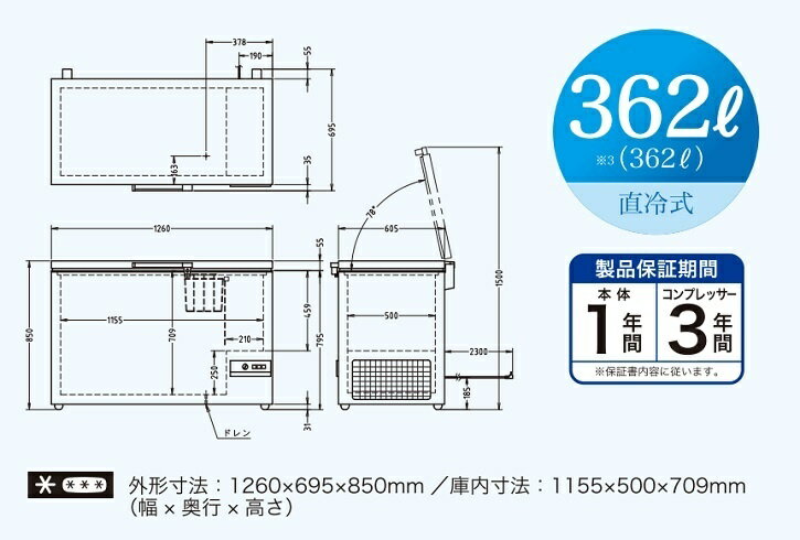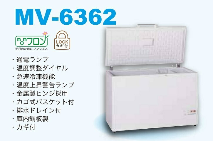 ■製品情報 メーカー 三ツ星貿易 エクセレンス 型式 MV-6362 外形寸法 W1260×D695×H850(mm) 内径寸法 W1155×D500×H709(mm) 有効内容量 362L 収納能力 電源 単相100V 50/60Hz 製品重量 65kg 定格消費電力130W 年間消費電力523Kwh/年 冷却方式 直冷式 温度帯 -18℃以下 本体色 ホワイト 付属品 カゴ1個・霜取り用ヘラ1個 備考 通電ランプ / 温度調整ダイヤル / 急速冷凍機能 / 温度上昇警告ランプ / 金属製ヒンジ採用 / カゴ式バスケット付 / 排水ドレイン付 / 庫内鋼板製 / カギ付 ※製品保証について※『本体1年保証・コンプレッサー3年保証』となります。