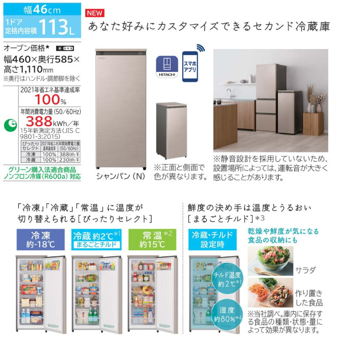 メーカー希望小売価格はメーカーカタログに基づいて掲載していますR-KC11R-N 商品説明シリーズ スマートストッカー セカンド冷蔵庫カラー シャンパン仕様・特徴 右開き 片開きタイプ113L【1〜2人向け】【小型】「冷凍」「冷蔵」「常温」に 温度が切り替えられる[ぴったりセレクト]フラットデザインまるごとチルド1ドアトリプルタワー脱臭ドアポケットクリアトレイ(1段目)クリアケース(2段目)スライドクリアバスケット(3・4段目)クリアバスケット(5段目)ノンフロンスマートフォン連携:日立冷蔵庫コンシェルジュアプリ※ アプリの利用には事前に「日立の家電品お客様サポート」への登録が必要です。