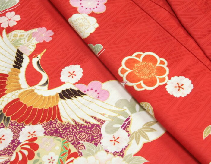 七五三 着物 7歳 女の子 四つ身着物 式部浪漫 赤地色 百花繚乱 鶴 サヤ地紋生地 日本製